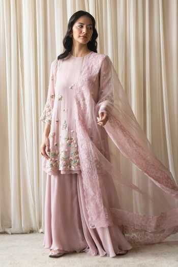 Buy Pink Chiffon Hand Embroidered Sequins Dutch Garden Kurta Sharara ...