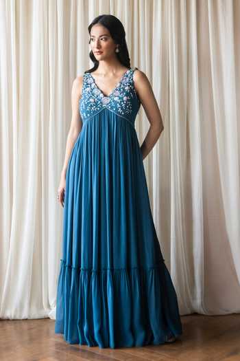 Buy Summer by Priyanka Gupta Blue Georgette Floral Embroidered Yoke ...