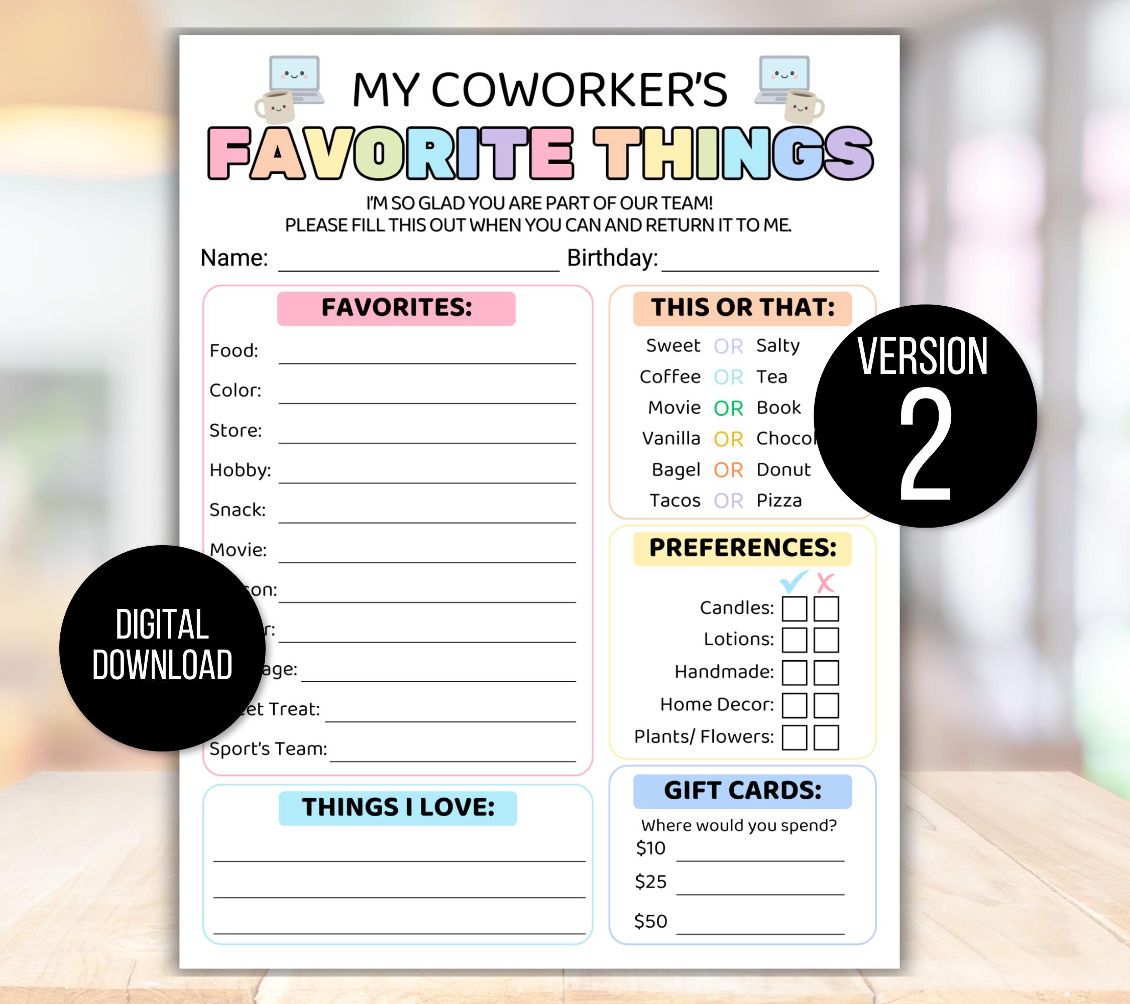 Employee Favorite Things List Printable, Coworker Things Questionnaire ...