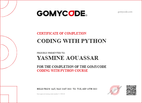 YASMINE AOUASSAR Certificate of Completion Coding With Python