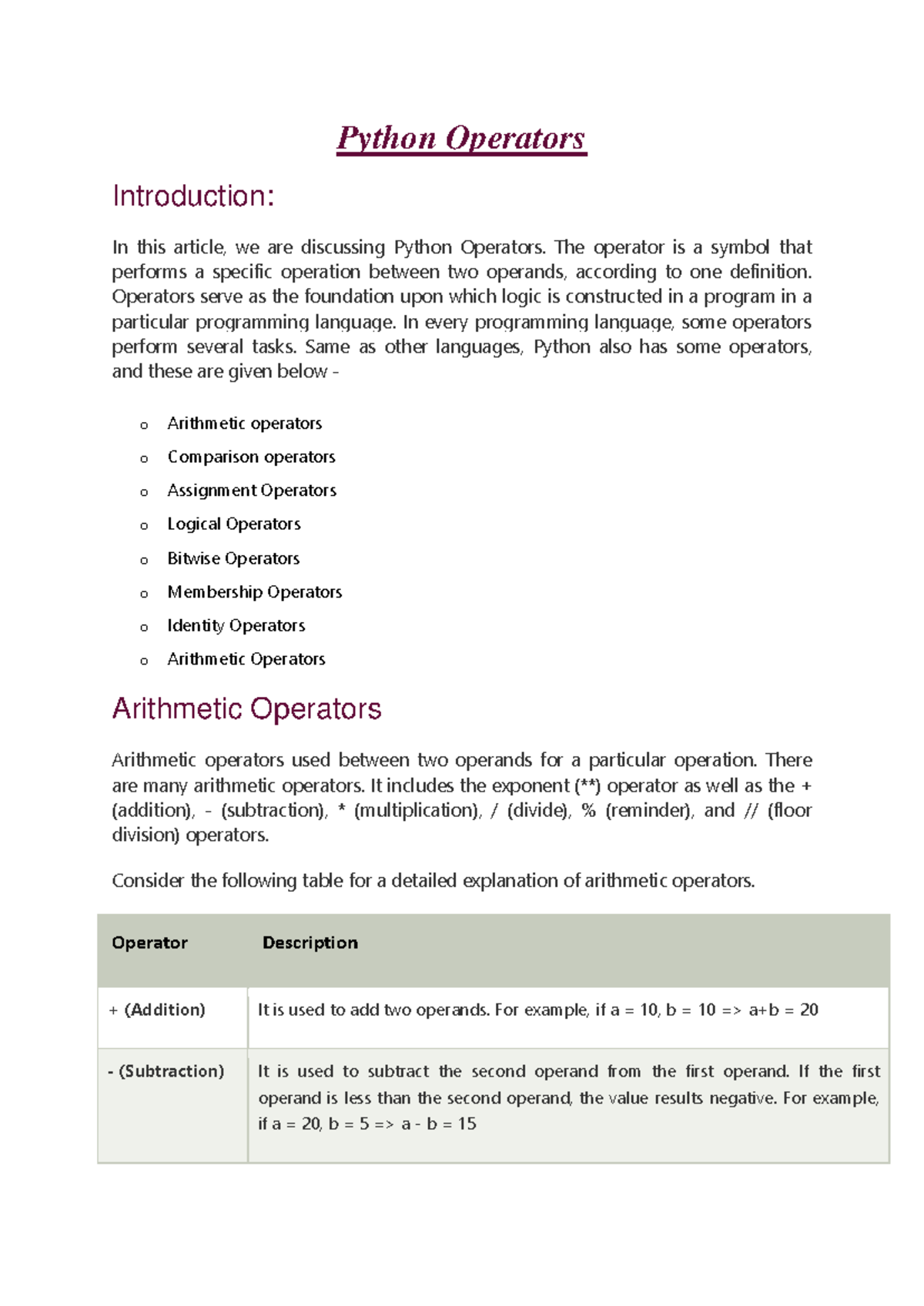 Python Operators - LECTURE NOTES - Python Operators Introduction: In ...