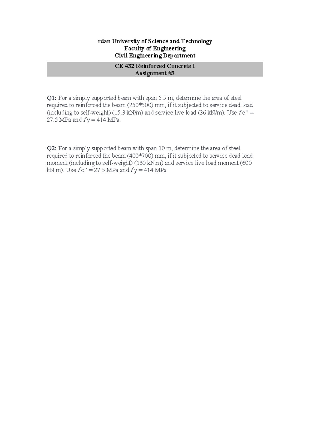 CE 432 Reinforced Concrete I Assignment: Beam Steel Area Calculation ...