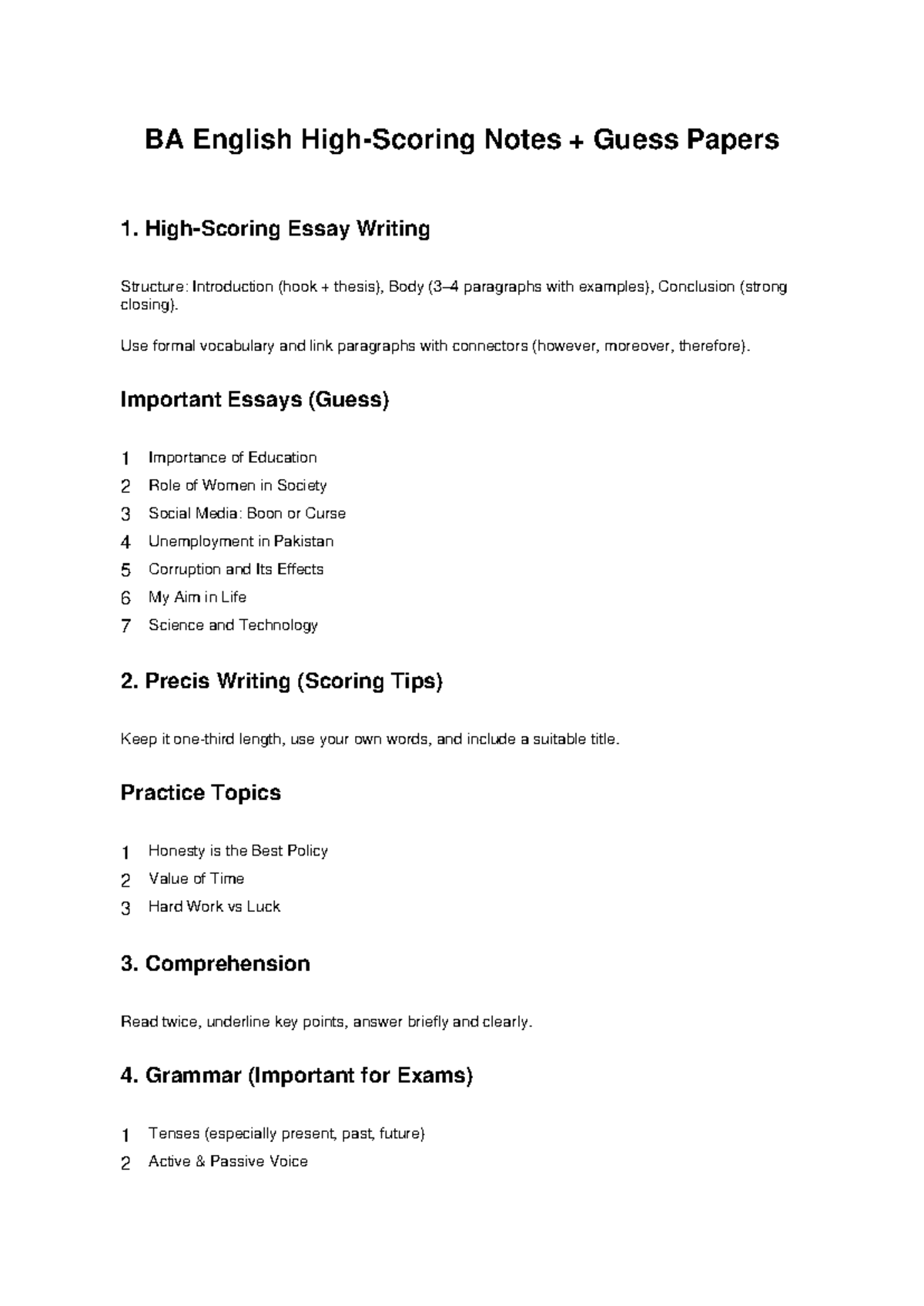 BA English High Scoring Notes: Essay Writing & Exam Tips - Studocu