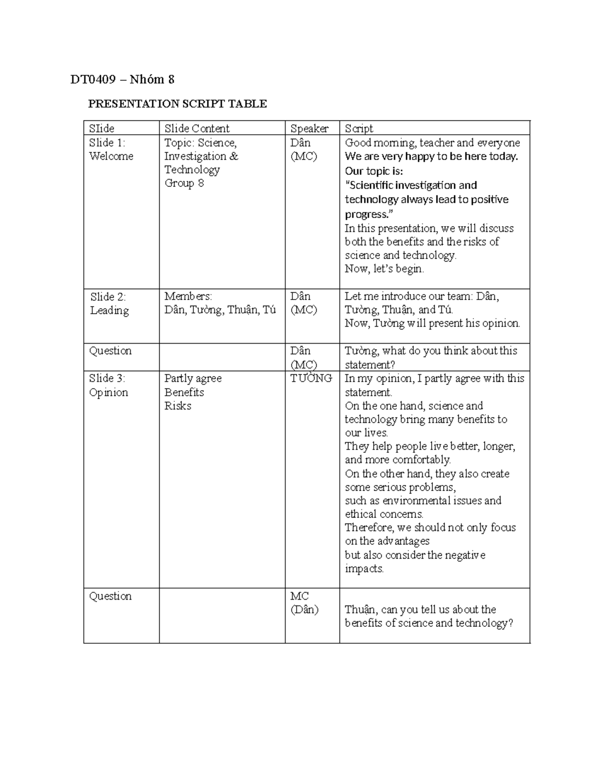 DT0409 Group 8 Presentation Script on Science & Technology - Studocu