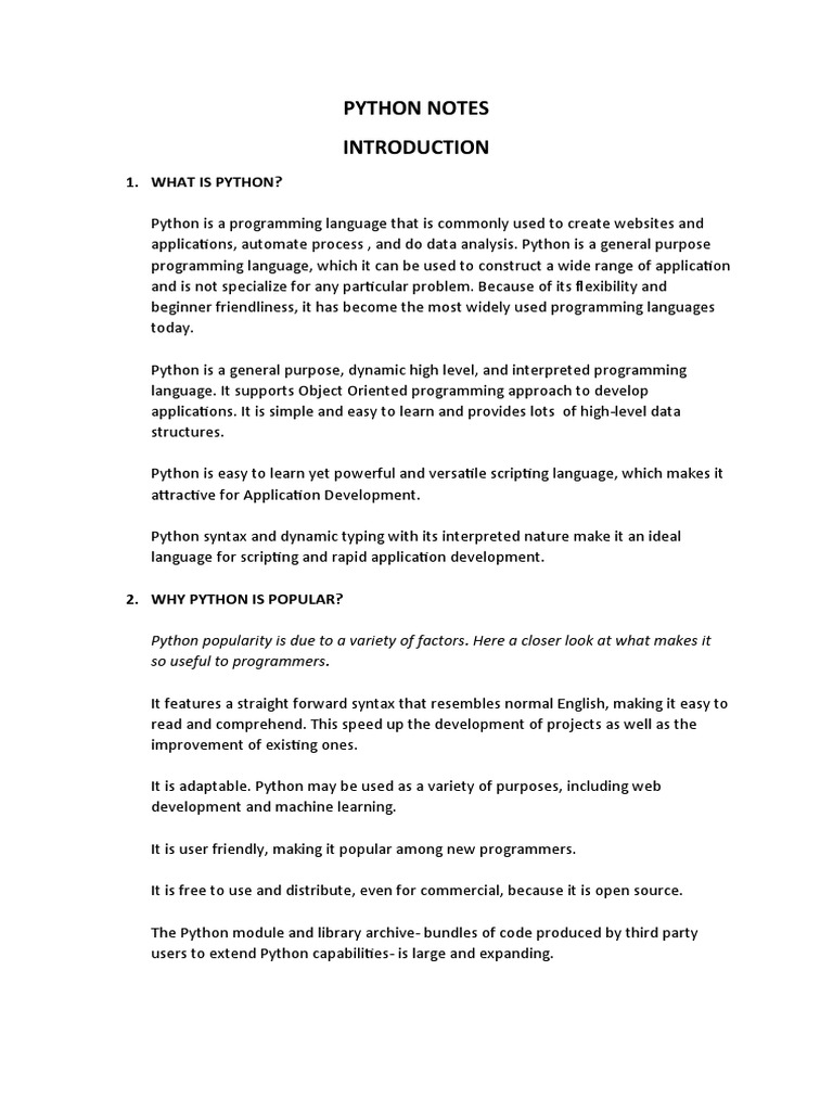 Introduction To Python - Notes | PDF