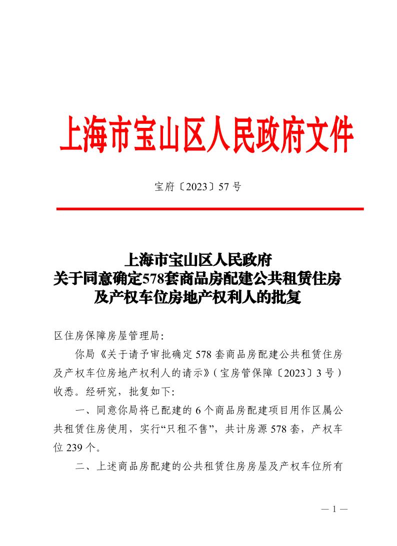 57号—上海市宝山区人民政府关于同意确定578套商品房配建公共租赁住房及产权车位房地产权利人的批复.pdf