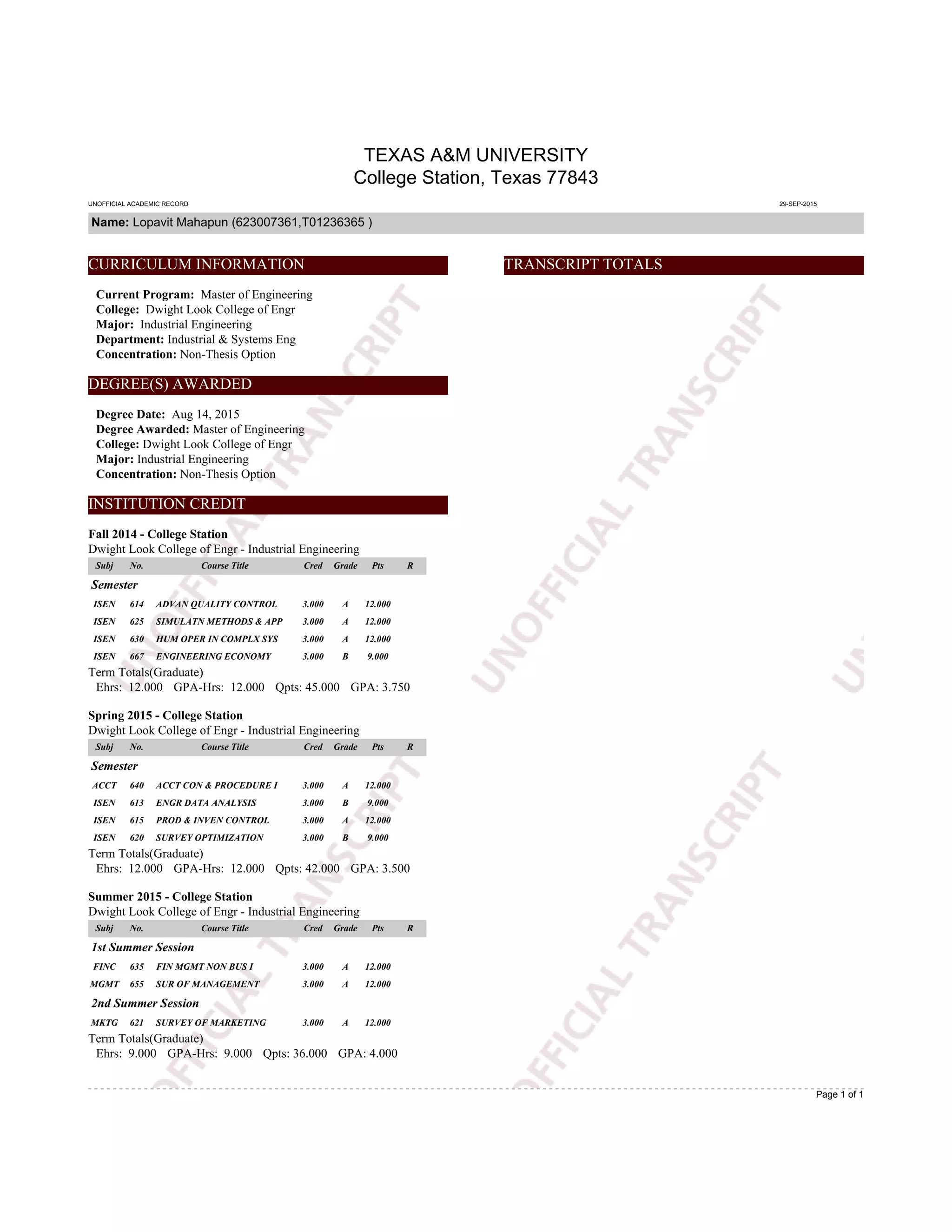 Unofficial Transcript 2015 | PDF