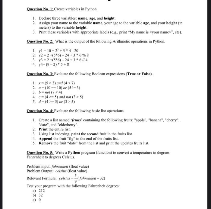 Based on this image's title: “Solved Question No. 1: Create variables in Python. 1. | Chegg.com”