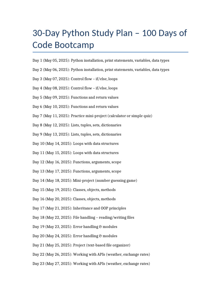 Based on this image's title: “Python 30 Day Study Plan | PDF”