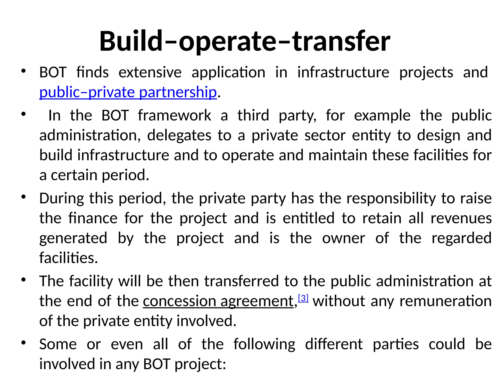 Build–operate–transfer (BOT) or build–own–operate–transfer (BOOT) is a ...