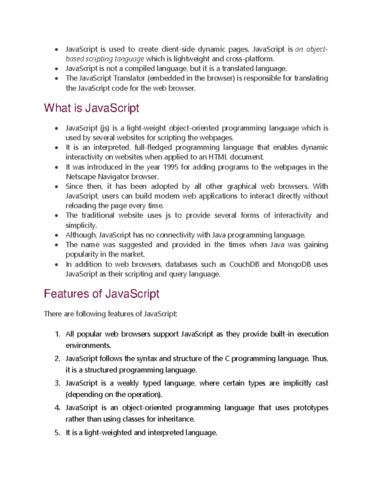 Javascript - Notes on History, Features, and Functions (CS101) - Studocu