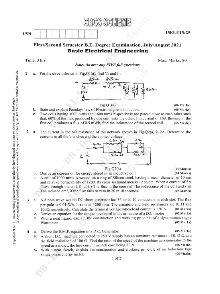 Be 1 Sem 2 Sem Basic Electrical Engineering 15ele15 Aug 2021 | PDF