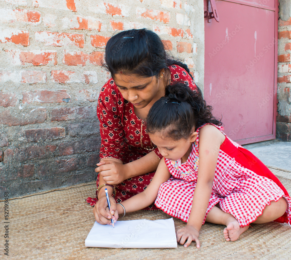 Mother teaching Hindi to daughter on her lap. Homeschooling, Happy ...