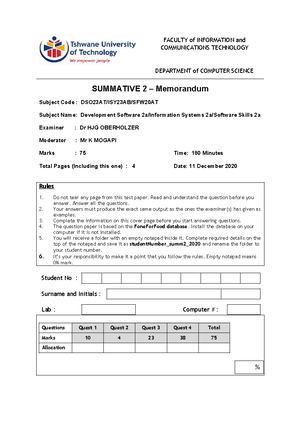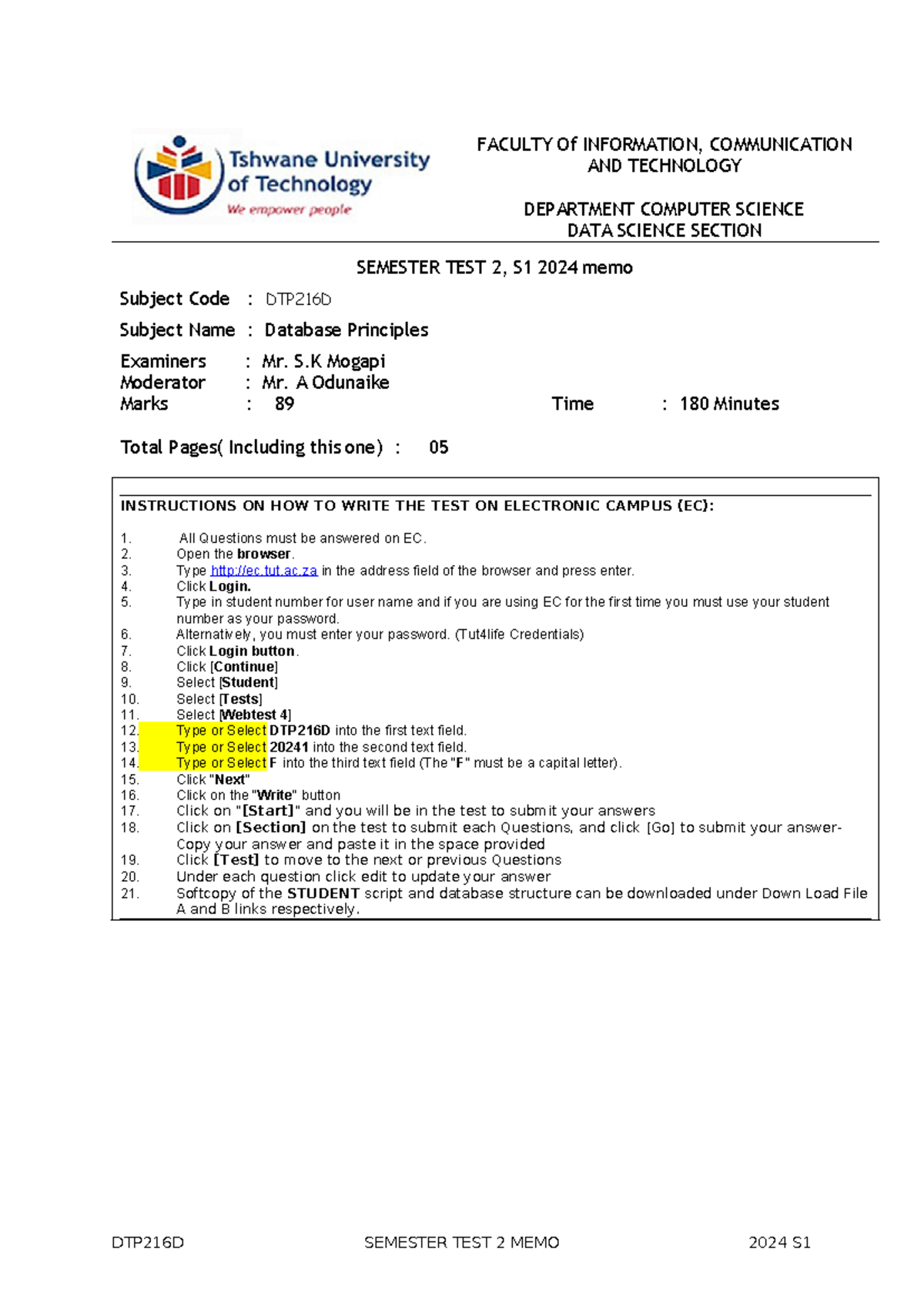 DTP216D - Semester TEST 2 MEMO 2024 S1 - FACULTY Of INFORMATION ...