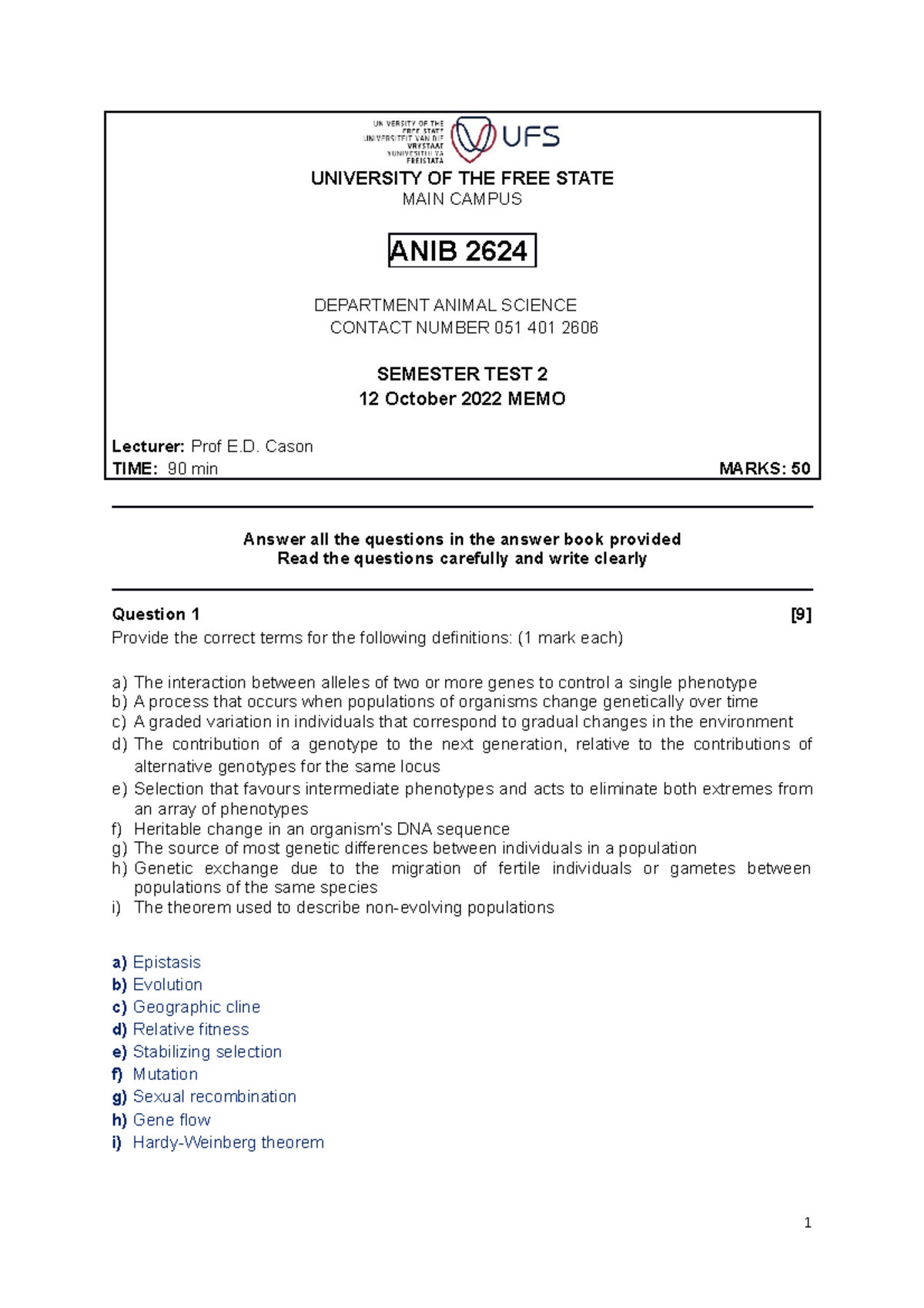 ANIB2624 Semester test 2 2023 Memo - UNIVERSITY OF THE FREE STATE MAIN ...