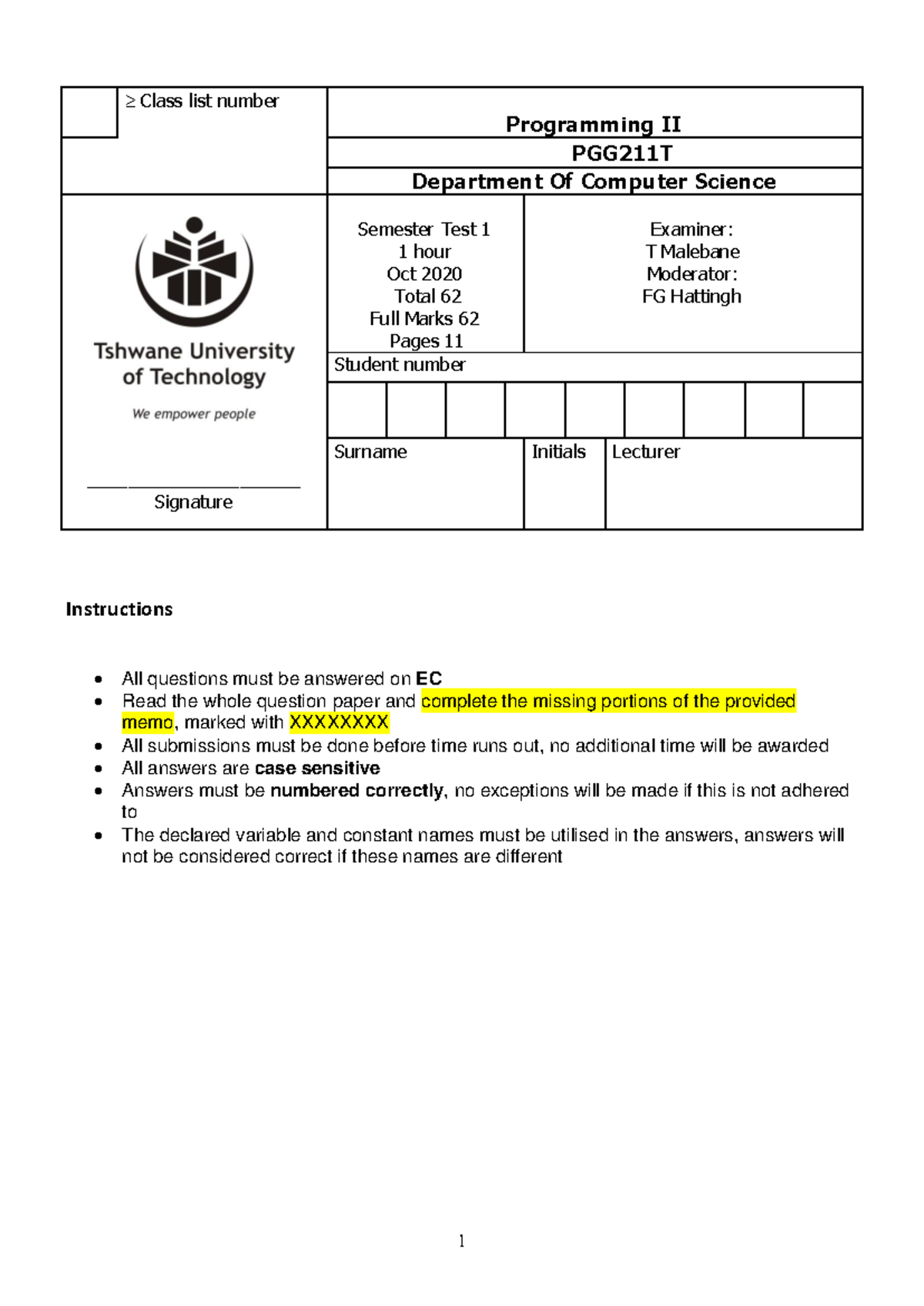 Smtest 1 PGG211T S120 - Semester test 1 - Class list number Programming ...