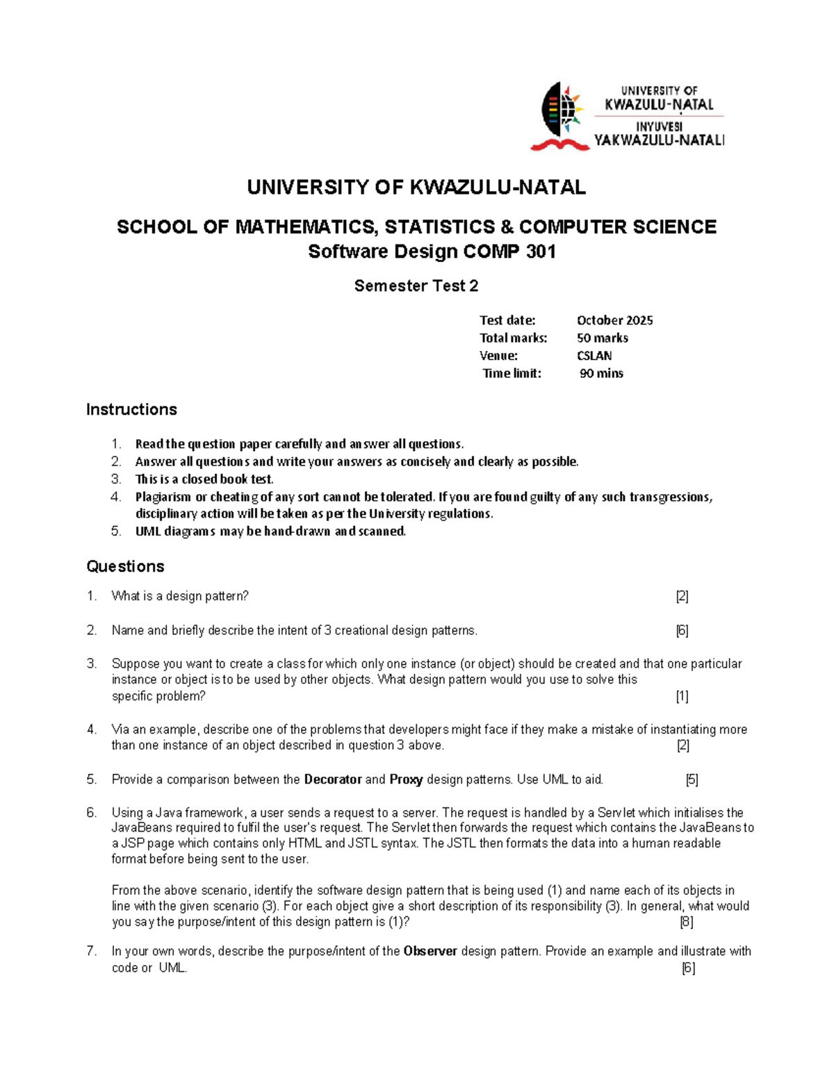 COMP 301 Software Design Semester Test 2 - October 2025 - Studocu
