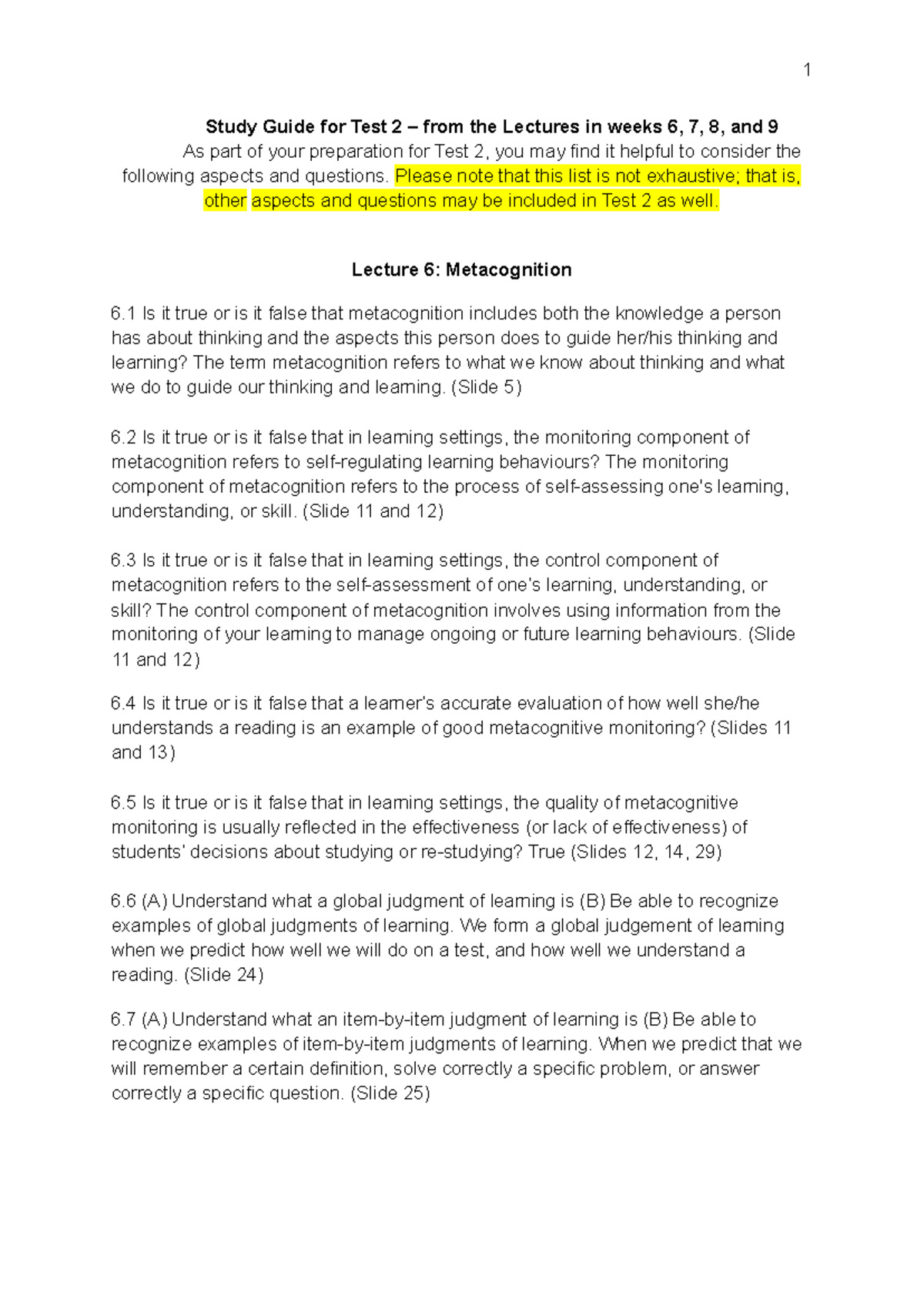 Study Guide for Test 2: Key Concepts from Lectures 6-9 - Studocu