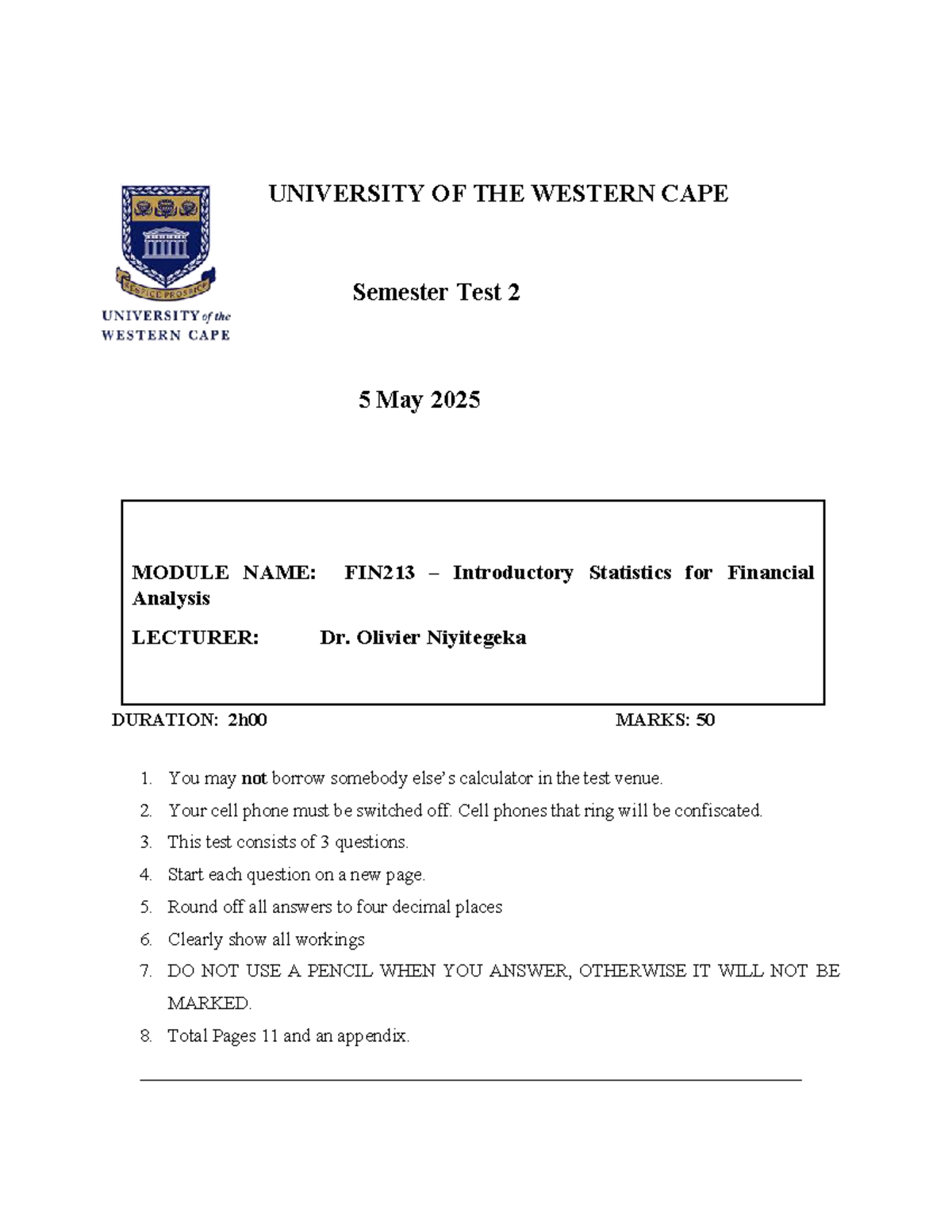 UWC FIN213 Semester Test 2: Introductory Statistics Overview - Studocu