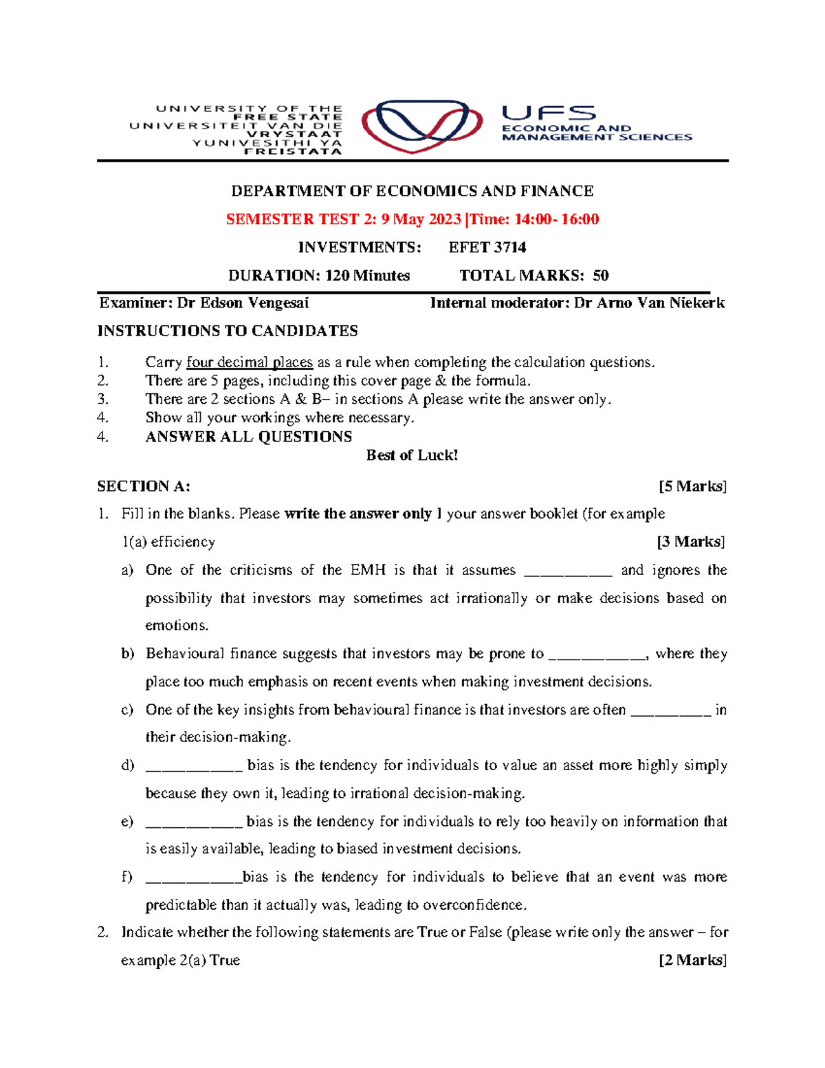 EFET 3714 - Semester Test 2 Investments - Past Year Questions - Studocu