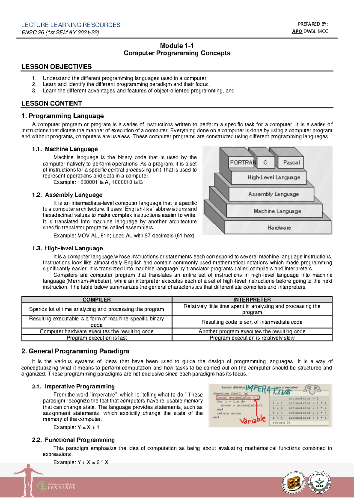 1-1 Computer Programming Concepts - LECTURE LEARNING RESOURCES ENSC 26 ...