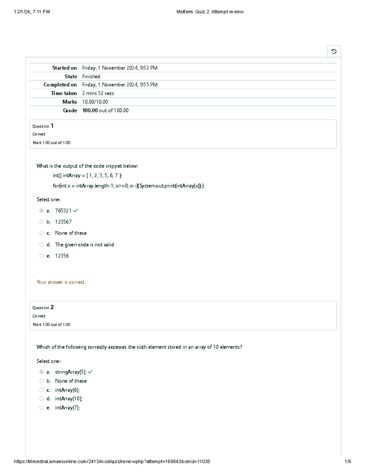 Computer Programming 2 Midterm Quiz 2: Attempt Review & Feedback - Studocu