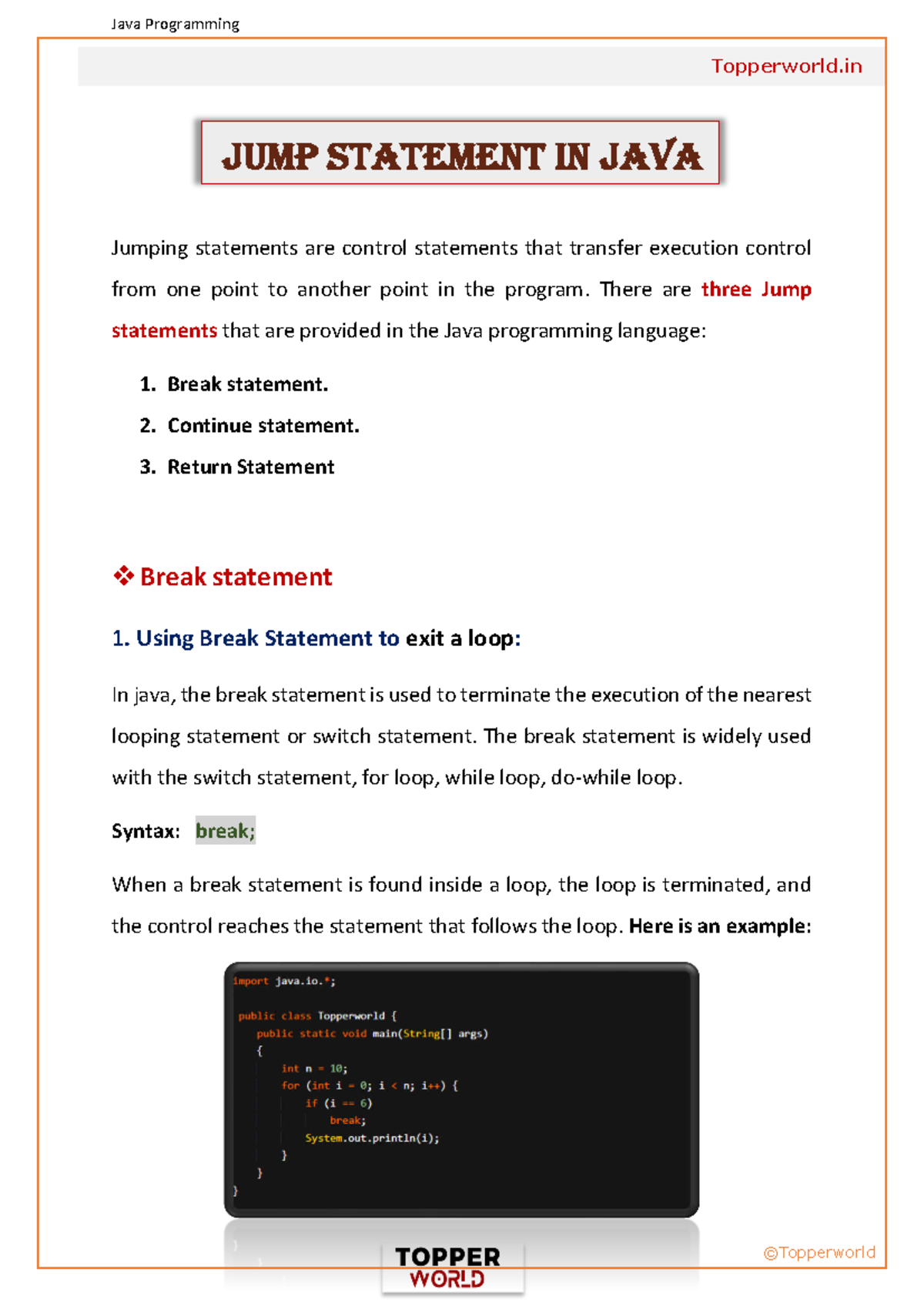 Jumping Statement in Java - Topperworld Jumping statements are control ...