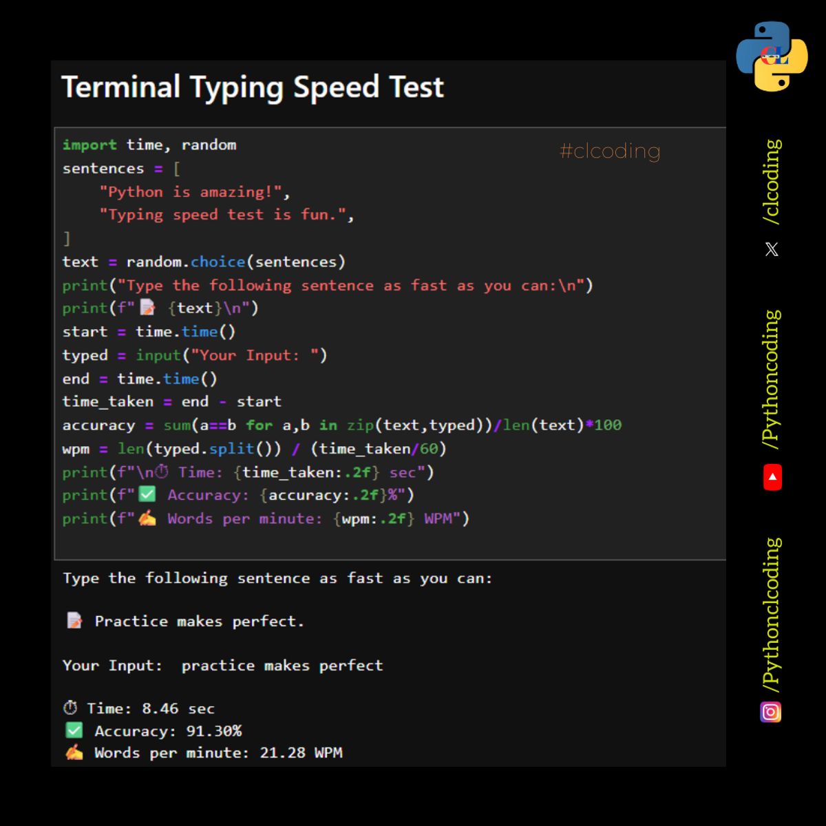 Terminal Typing Speed Test — Python Coding (CLCODING) - Buymeacoffee