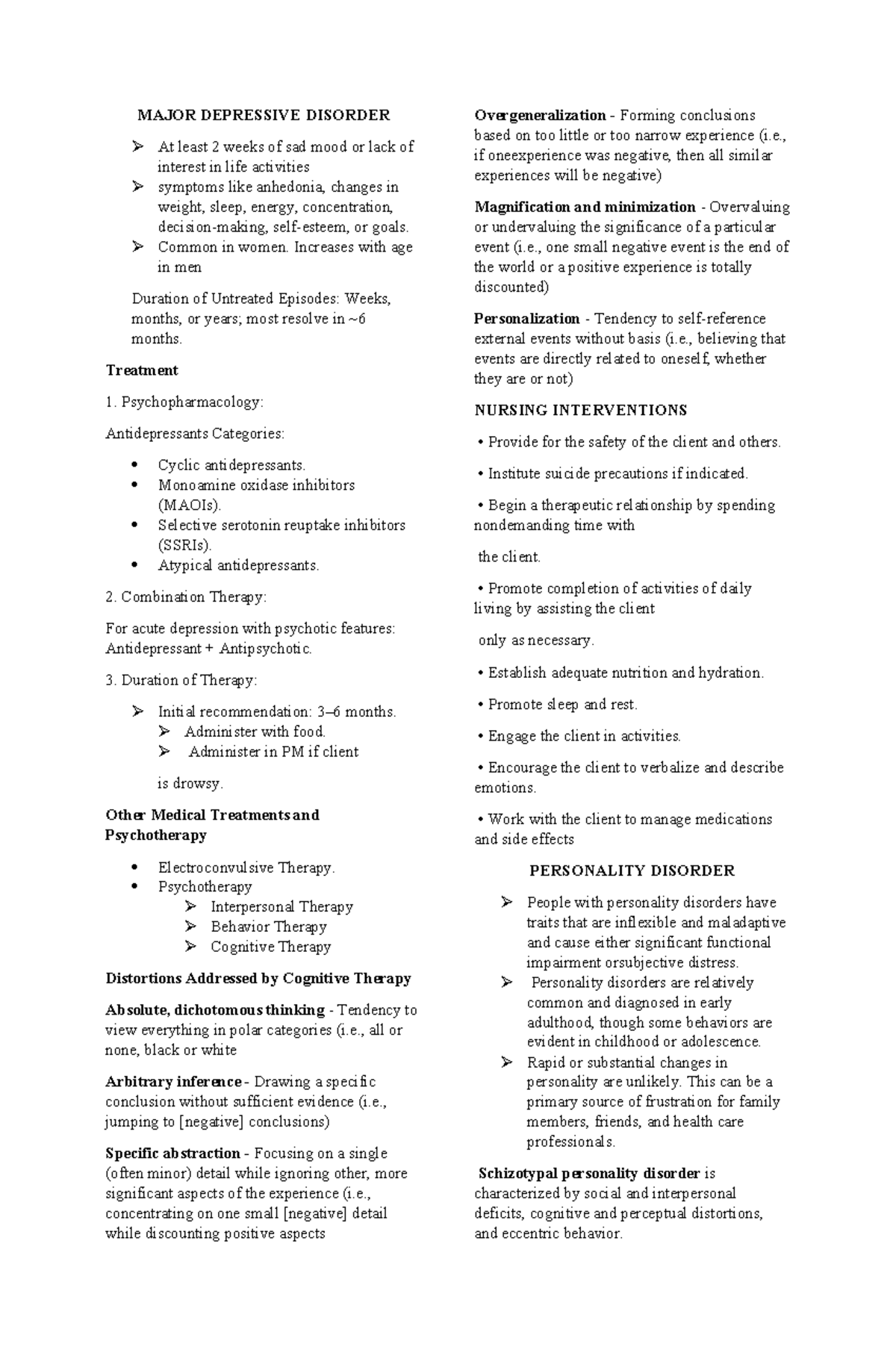 Midterm Notes on Major Depressive, Anxiety, and Personality Disorders ...