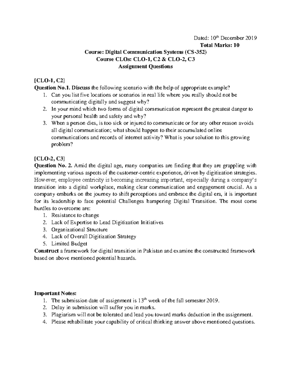 DCS - DCS - Dated: 10th December 2019 Total Marks: 10 Course: Digital ...