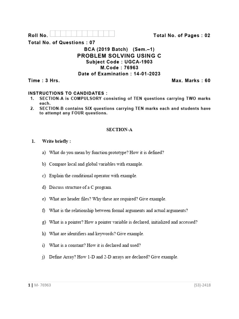 Bca 1 Sem Cs Problem Solving Using c n 123 2019 | PDF