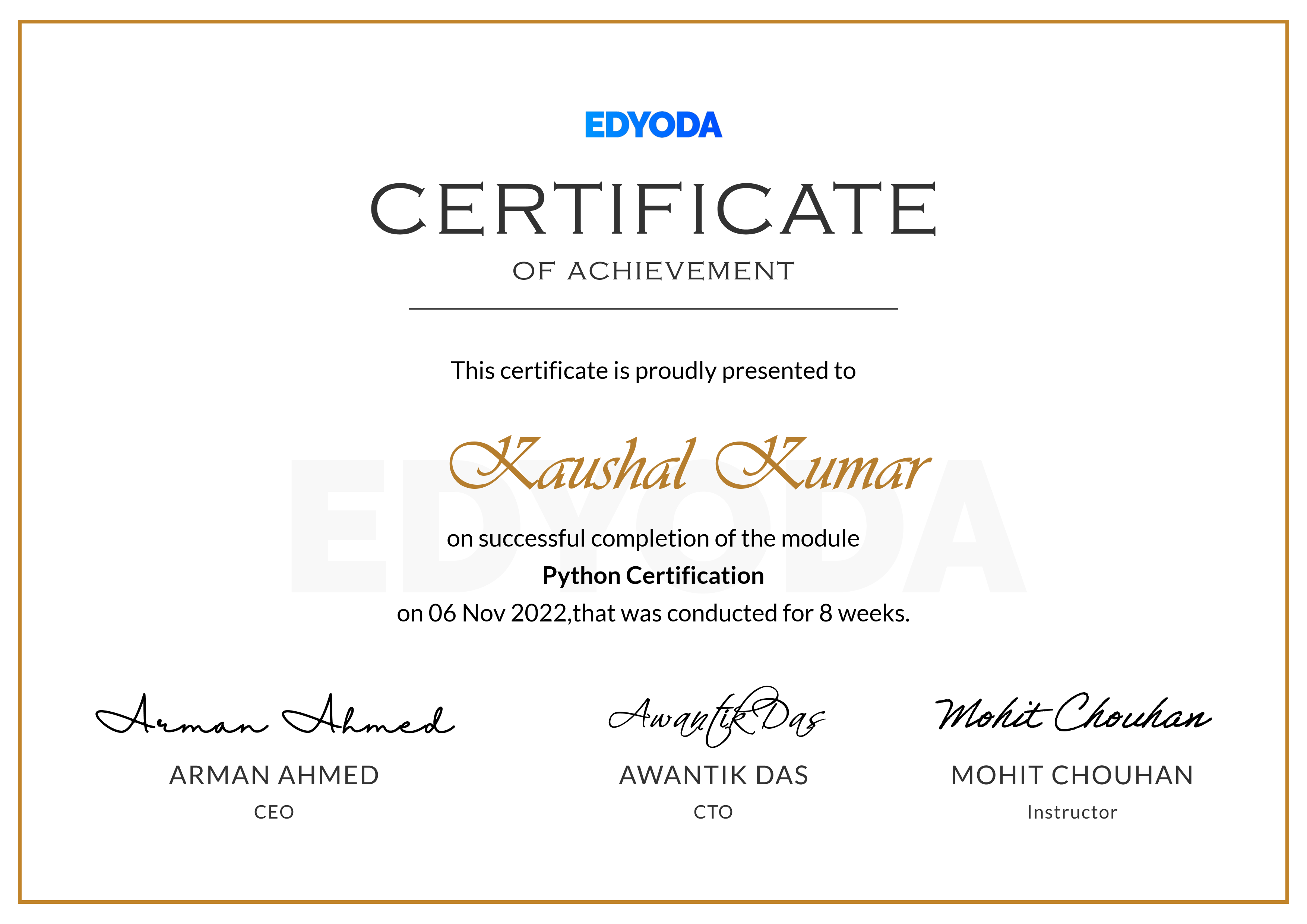 I am fortunate to announce the completion of my certification in Python ...