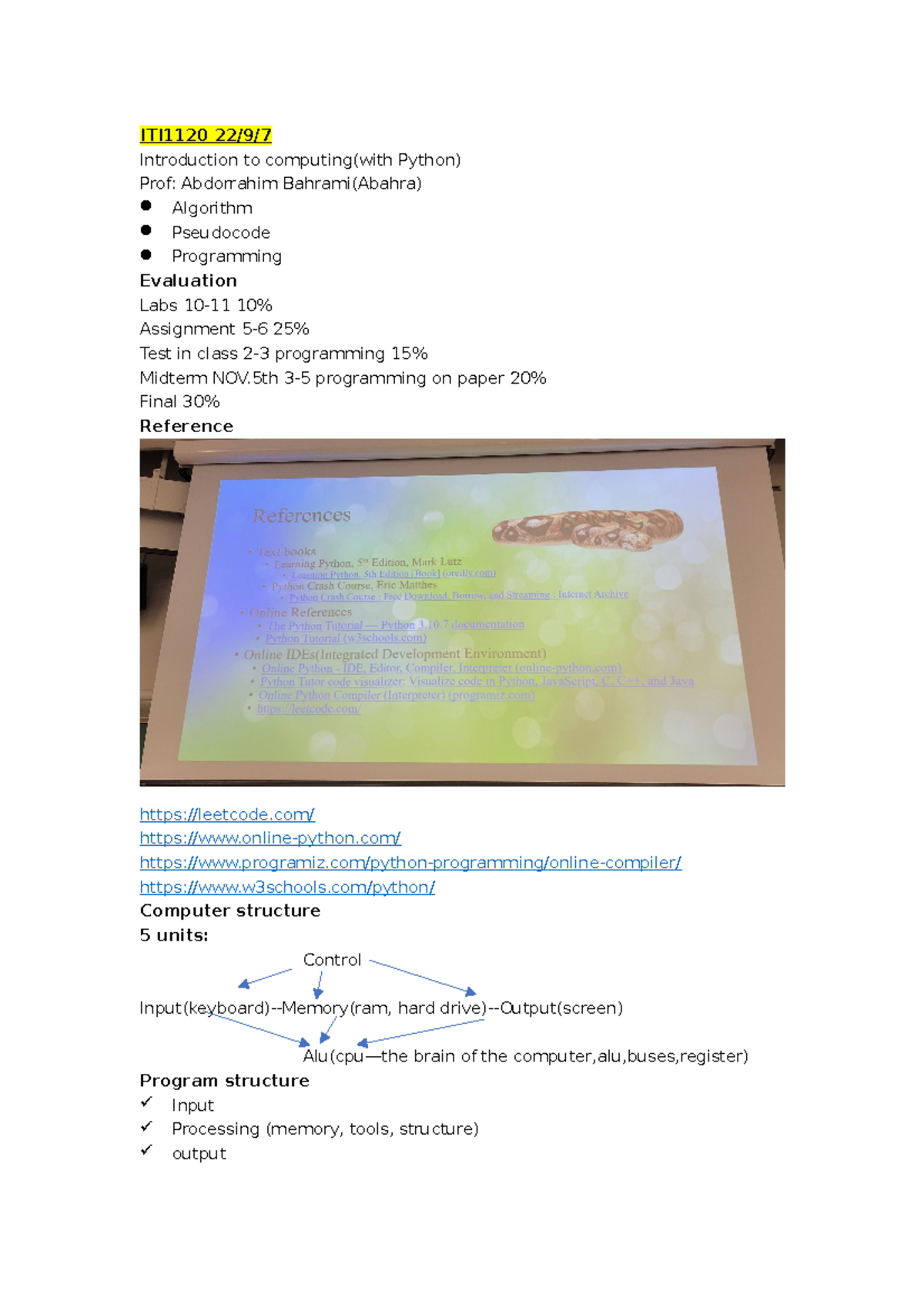 ITI1120 notes - ITI1120 22/9/ Introduction to computing(with Python ...