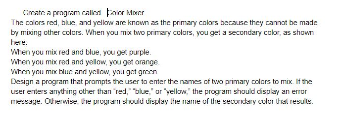 Solved Create a program called olor Mixer The colors red, | Chegg.com