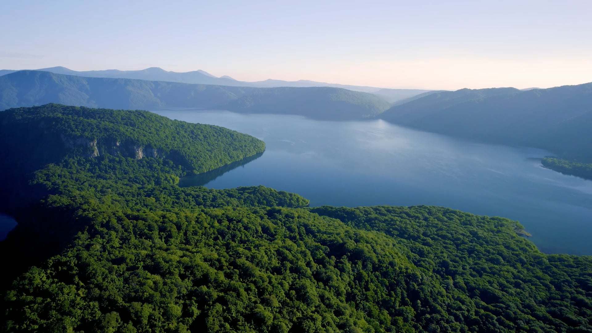 Drone views of Lake Towada, Japan's crater lake in Honshu Island