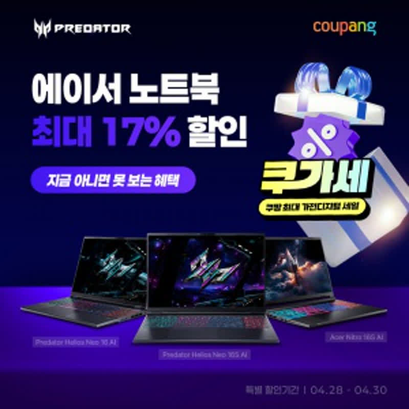 에이서, 쿠팡 '쿠가세' 참여.. 주요 노트북 라인업 특별가에 한정 기간 추가 할인