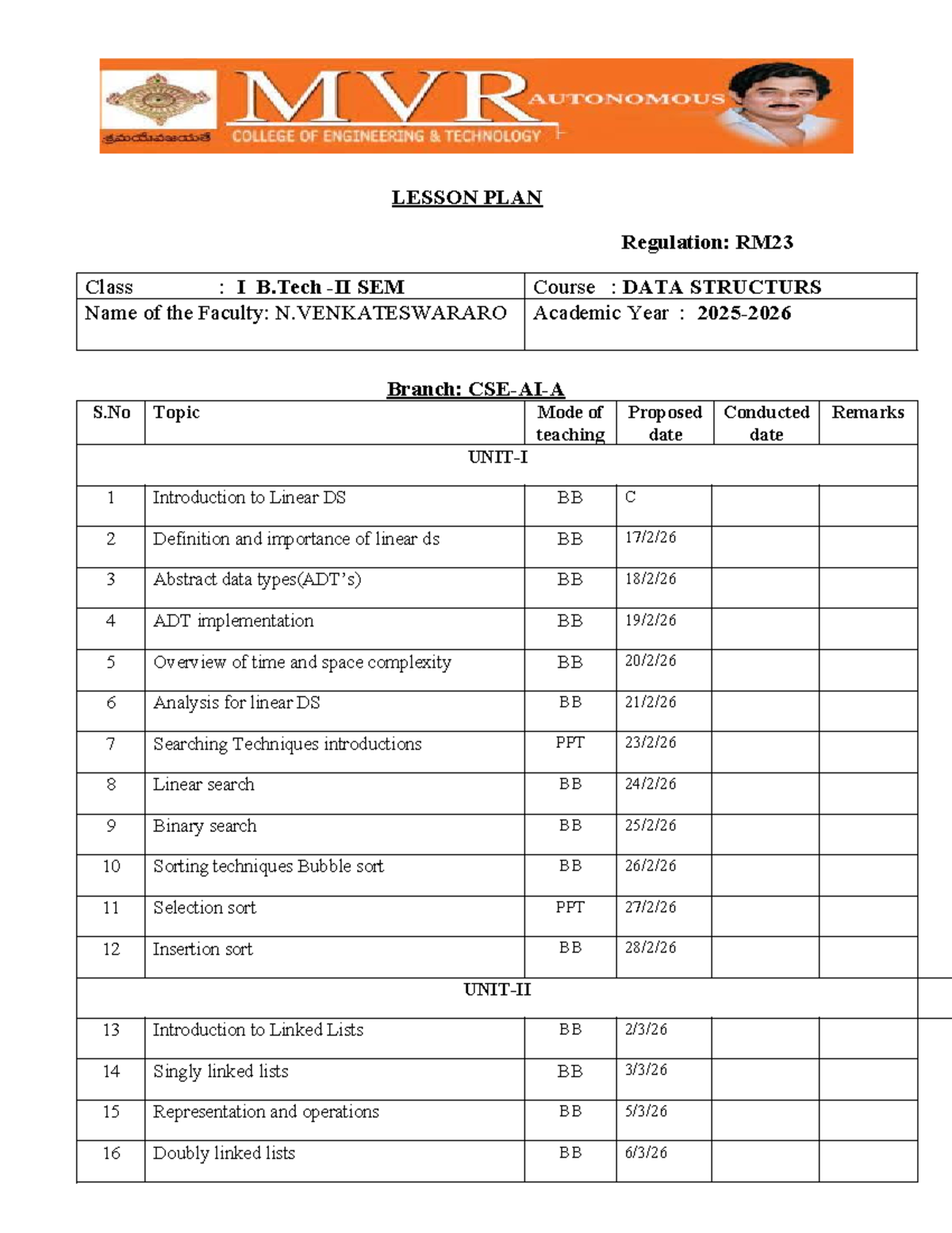 LESSON PLAN: Data Structures (RM23) for I B.Tech SEM by N. Venkat - Studocu