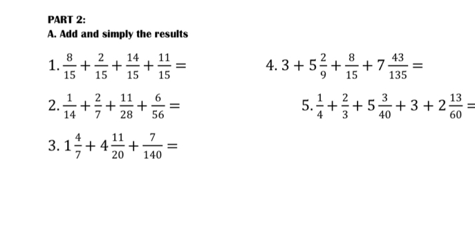 Solved: Add and simply the results 1. 8/15 + 2/15 + 14/15 + 11/15 = 3+5 ...