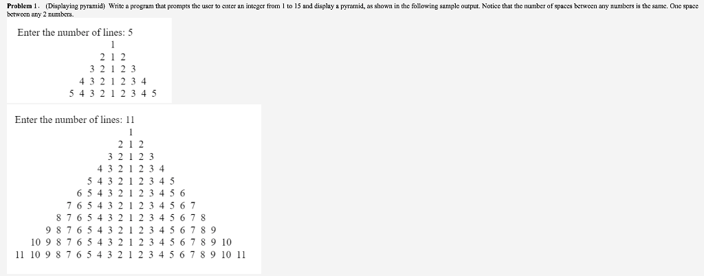 Based on this image's title: “Solved 1. (Display numbers in a pyramid pattern) Write a | Chegg.com”