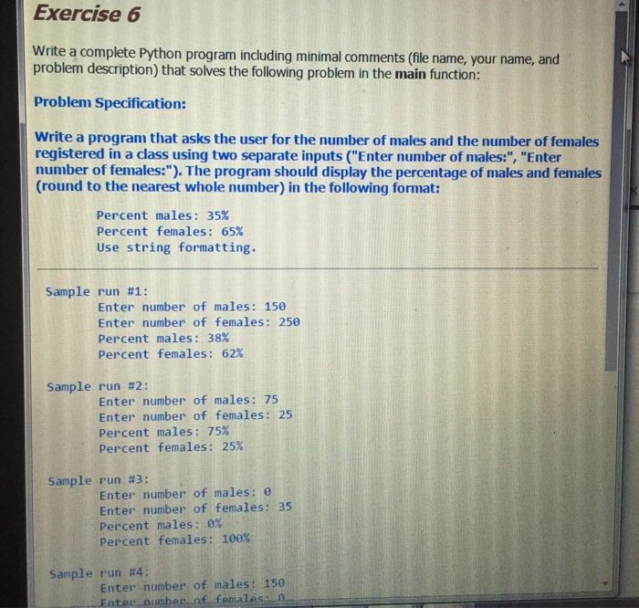 Solved Exercise 6 Write a complete Python program including | Chegg.com