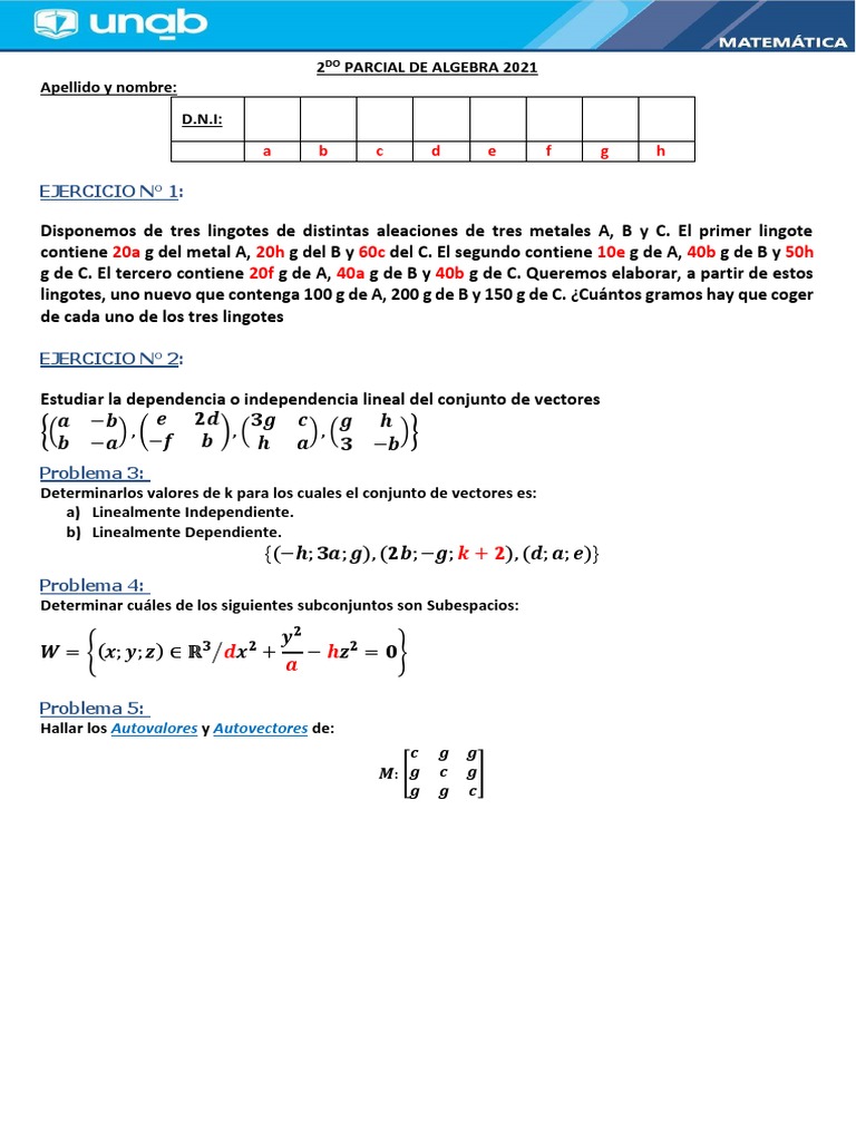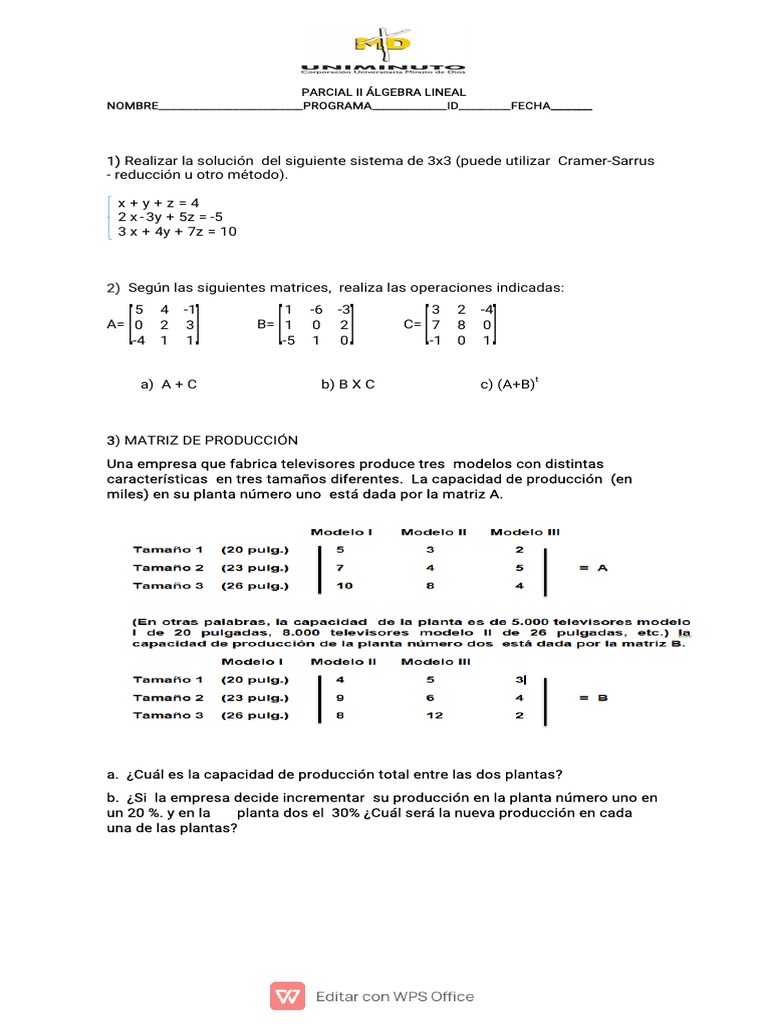 Segundo Parcial Álgebra Lineal | PDF | Matriz (Matemáticas ...