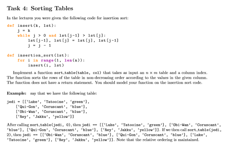 Solved Task 4: Sorting Tables In the lectures you were given | Chegg.com