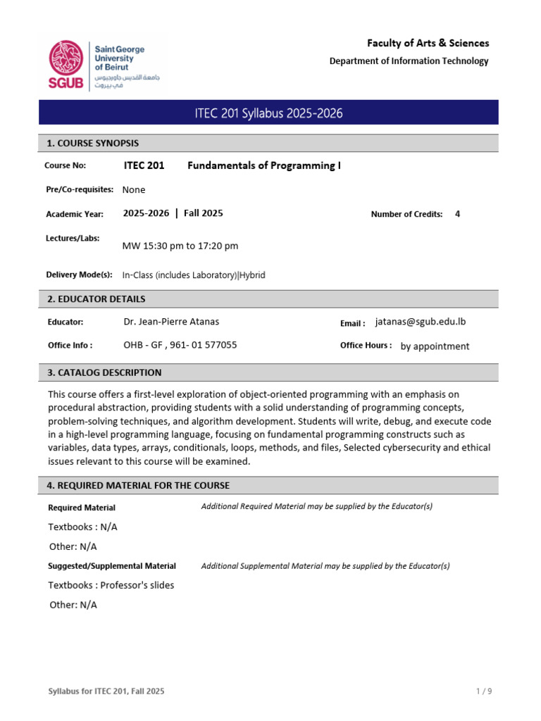 ITEC 201 Course Syllabus Fall 2025 | PDF | Java (Programming Language ...