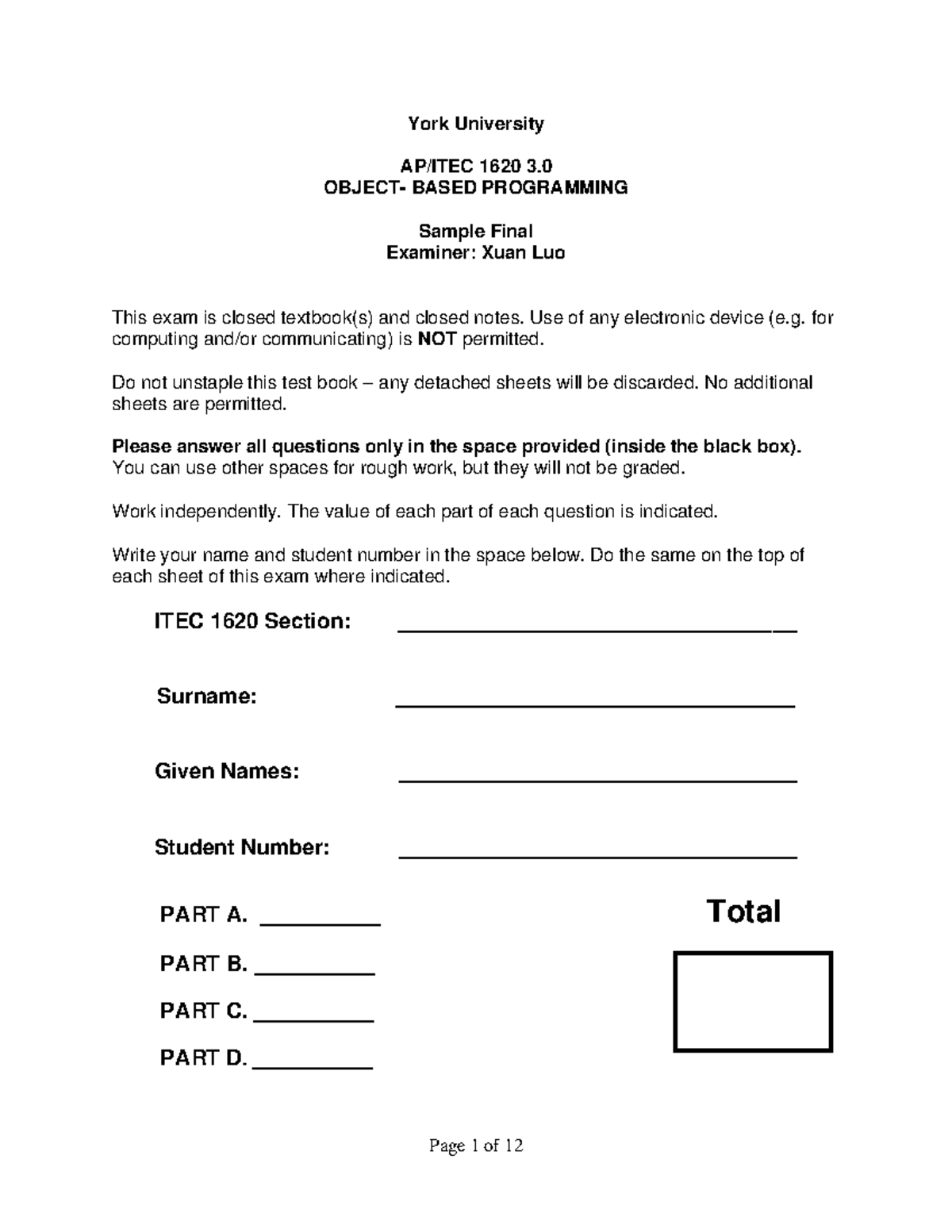 Midterm Sample 2 Solution - York University AK/ITEC 1620 3. OBJECT ...