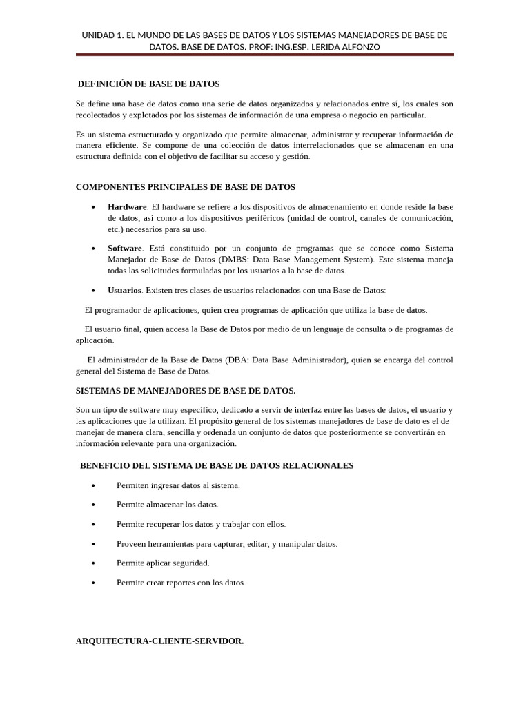 Definición de Base de Datos GUIA UNIDAD 1 | PDF | Bases de datos | SQL