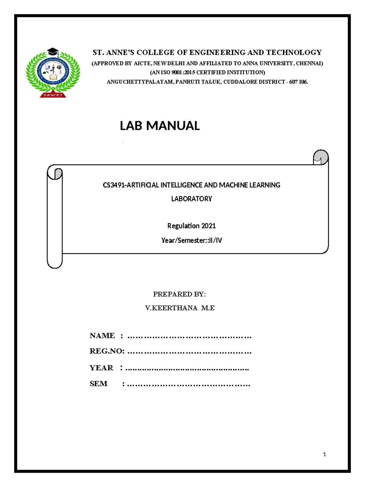 AI and ML Lab Manual - Practical Records and Implementations - Studocu