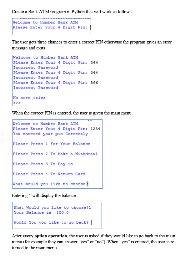 Solved Create a Bank ATM program in Python that will work as | Chegg.com