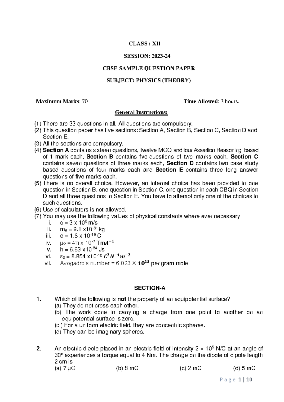 Class XII CBSE Physics Sample Question Paper (Theory) - 70 Marks - Studocu