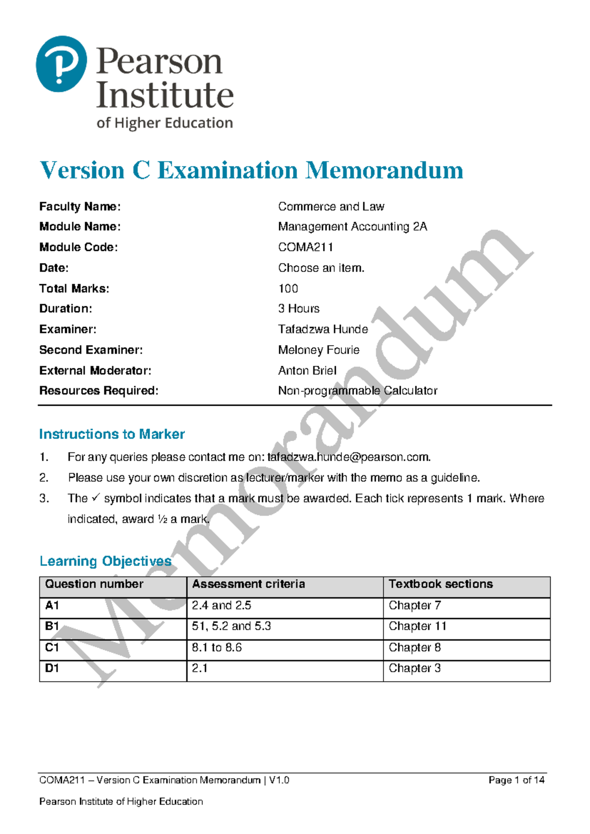 COMA211 - Management Accounting 2A Version C Exam Memorandum - Studocu