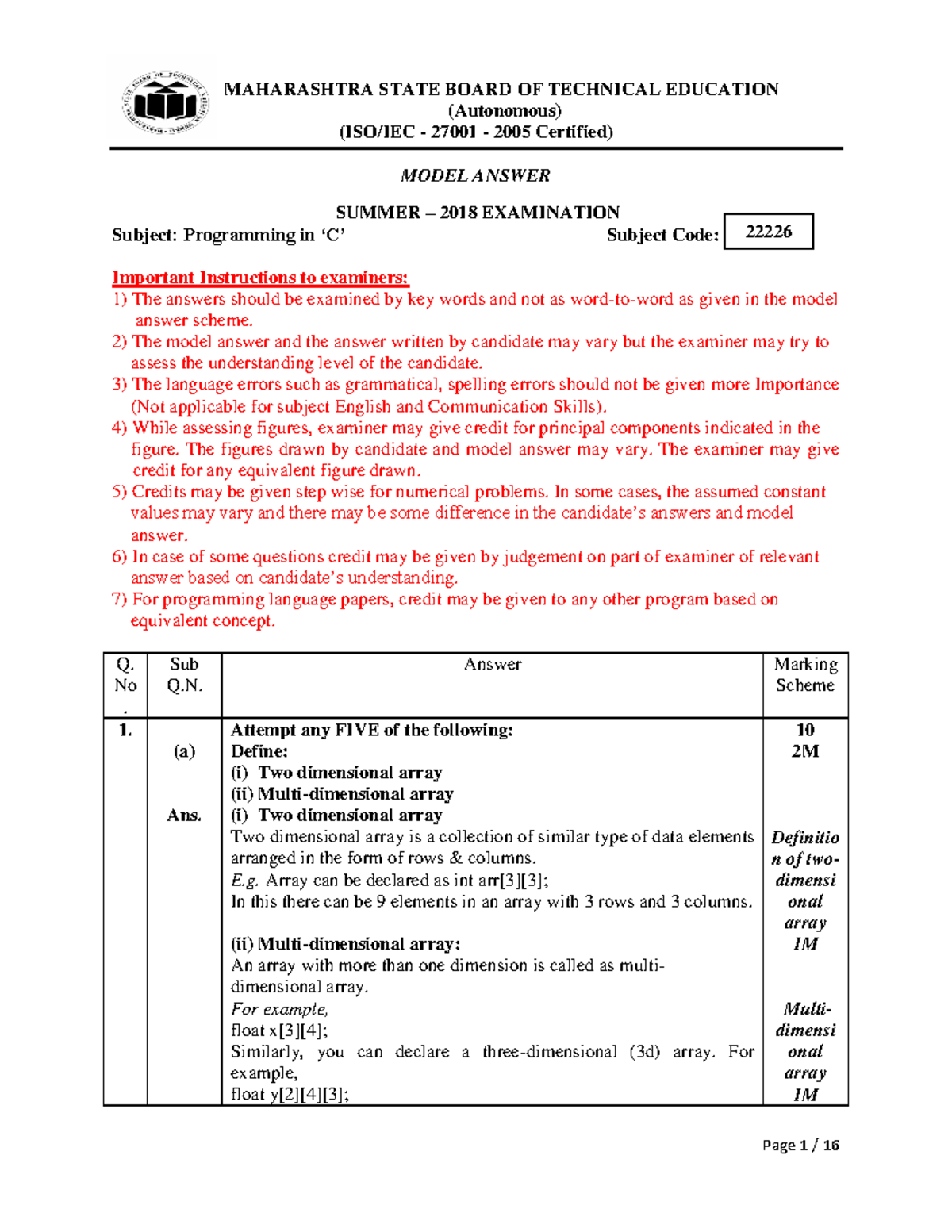22226 Model Answer Paper for Summer 2018 Programming in ‘C' Exam - Studocu